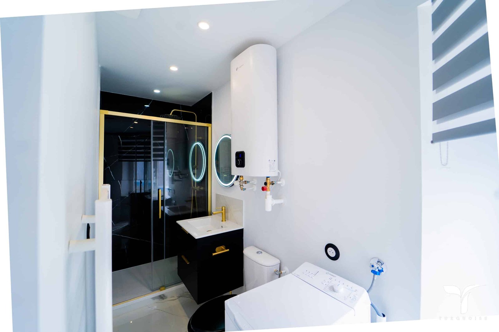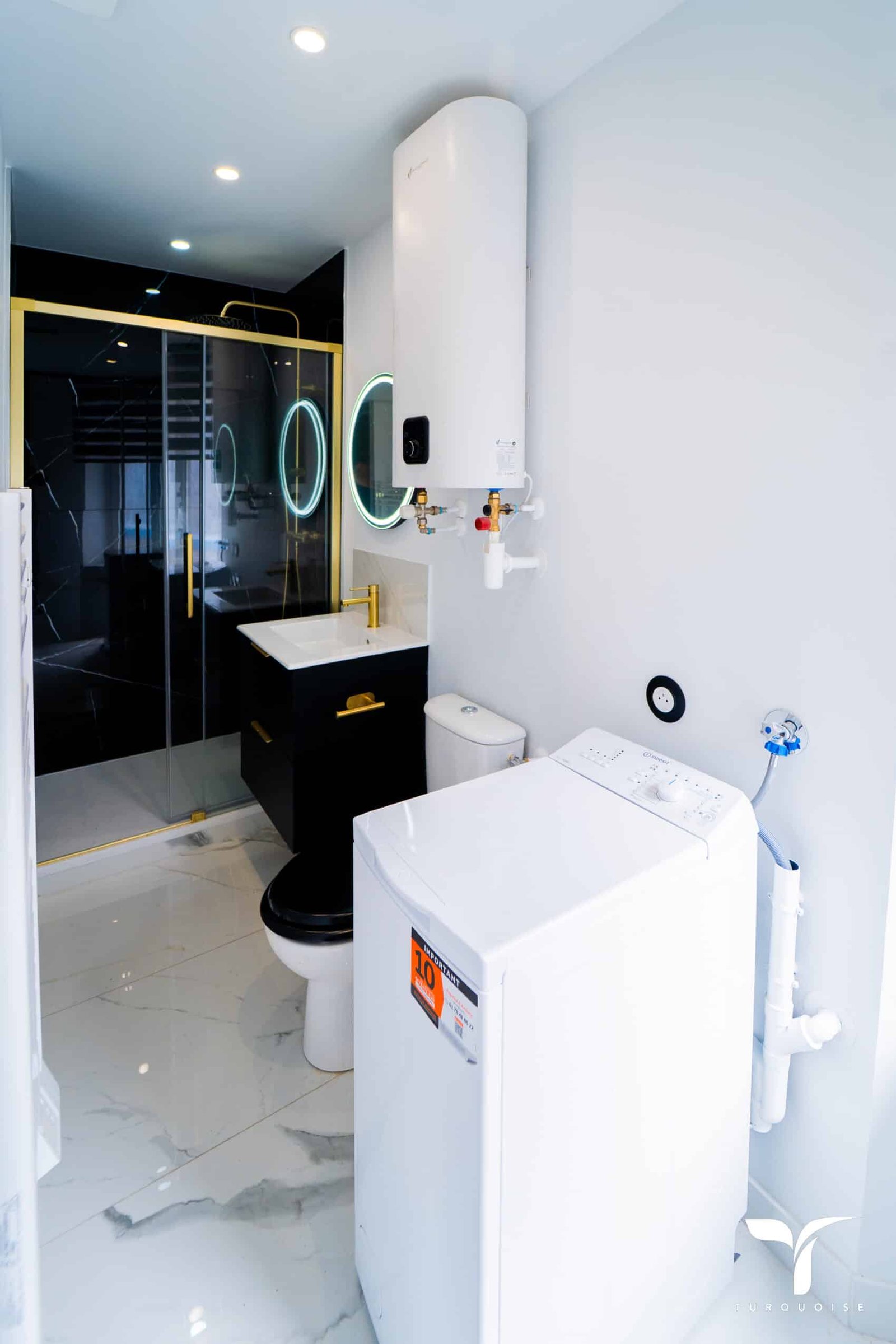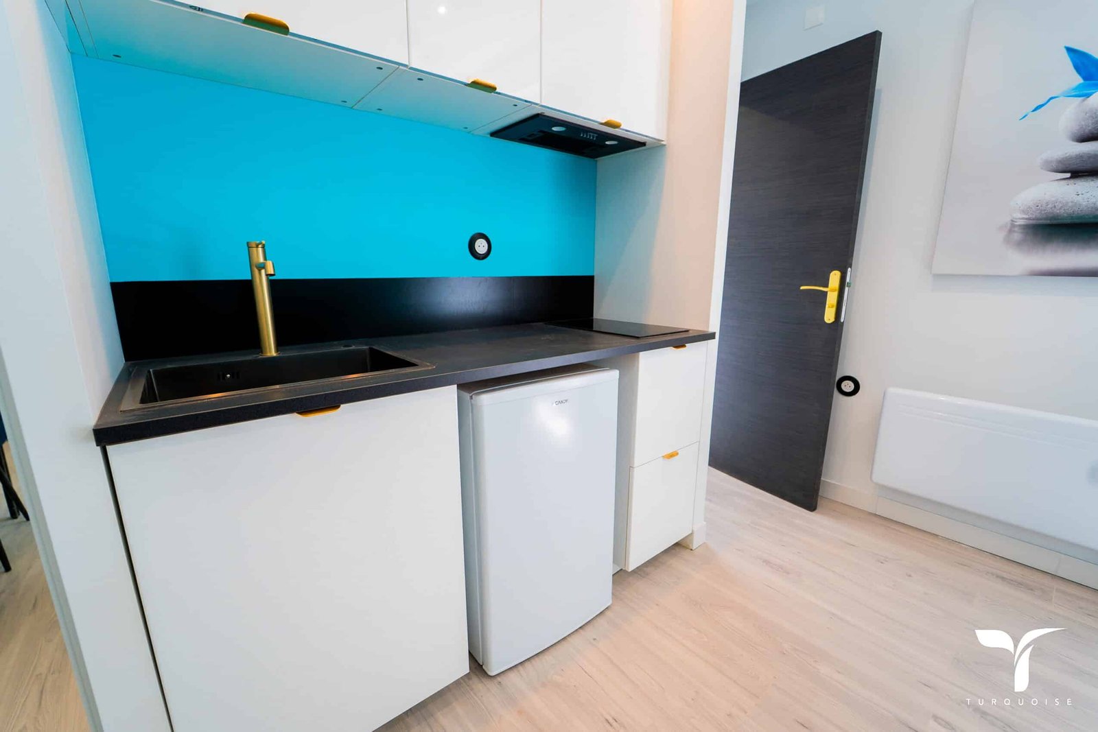 - Pièce de vie avec grand canapé 3 places et grande TV Samsung de 140 cm. - Cuisine équipée.